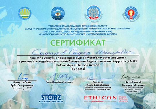 *2016 г Участие в преконгресс курсе «Метоболическая хирургия» в рамках VI съезда Казахстанской Эндоскопичеспических Хирургов (КАЭХ) . Актобе Казахстан.